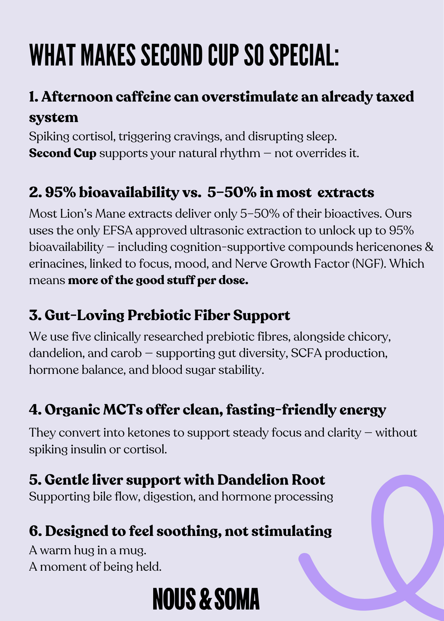 Second Cup is crafted to restore calm focus and balanced energy — the kind that carries you through the day without spikes or slumps. With nootropics like lion’s mane for cognitive sharpness, MCT oil for clean brain fuel, and magnesium bisglycinate for a calm, steady mind, it helps you feel clear, centred, and switched on — naturally.